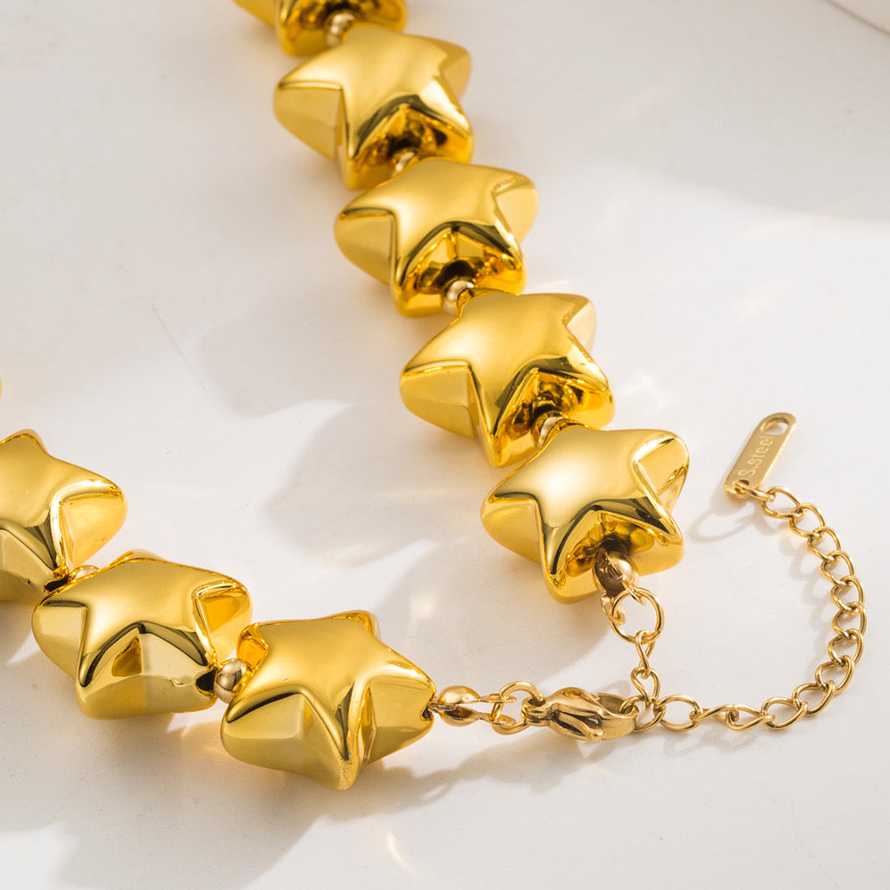 Un collar estrellado, por sus estrellas chunkys doradas en color dorado, con un estilo bold maximalista, si te gusta atreverte a usar piezas de joyería diferentes esta opción es para ti.